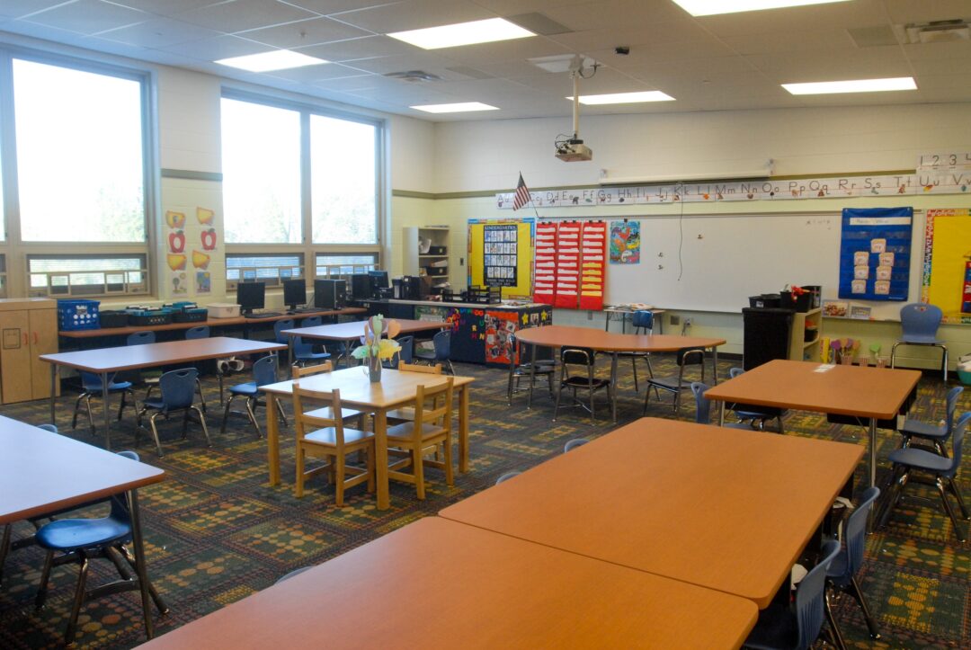The single story facility has a two-story in the classroom wing and includes a gymnasium, classrooms, offices, common areas and playground areas for different ages groups.