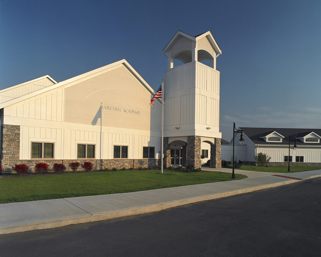 A new 40,000 SF, two-story private PK-8 elementary school facility for Mars Hill Academy, which includes two classroom wings with a pond/outdoor learning center, art rooms, science rooms, music rooms, library, a cafeteria, administrative offices, multi-purpose rooms and a central registration area. The new facility was built to accommodate 350 students, tripling the capacity of the former facility. Site work included a retention pond with a water fountain, a bell tower, two soccer fields and two baseball fields.