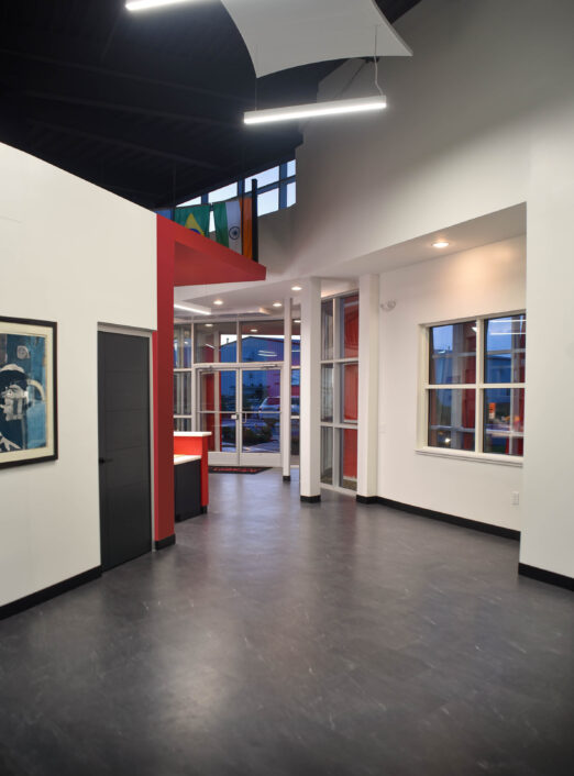 The revitalized building will feature 17 new offices, two new conference rooms, a fitness room, an expanded parking lot, a 2,600 SF workshop/ warehouse, and an 1,800 SF reception area with an adjacent kitchen and courtyard (known as The Family Room) that will also provide a flexible space for meetings and events. Connecting The Family Room/first floor and the second floor of the new building will be a wide staircase with a landing that looks over The Family Room. Existing building renovations include an updated and connected lobby area and opening up office and workspaces throughout the current office.